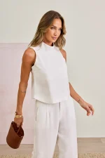 Blusa feminina sem mangas, com um design minimalista e contemporâneo, destacando sua gola levemente alta que traz um toque de elegância discreta. Confeccionada em tecido composto por 90% viscose e 10% poliéster, a peça oferece uma textura suave e confortável ao toque, além de garantir excelente caimento. Versátil e atemporal, é ideal para composições que vão do casual ao sofisticado com facilidade.