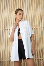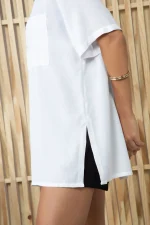 -Detalhe: Camisa chemise alongada, com bolso frontal, corte reto e abertura lateral.