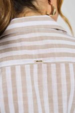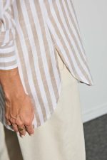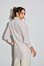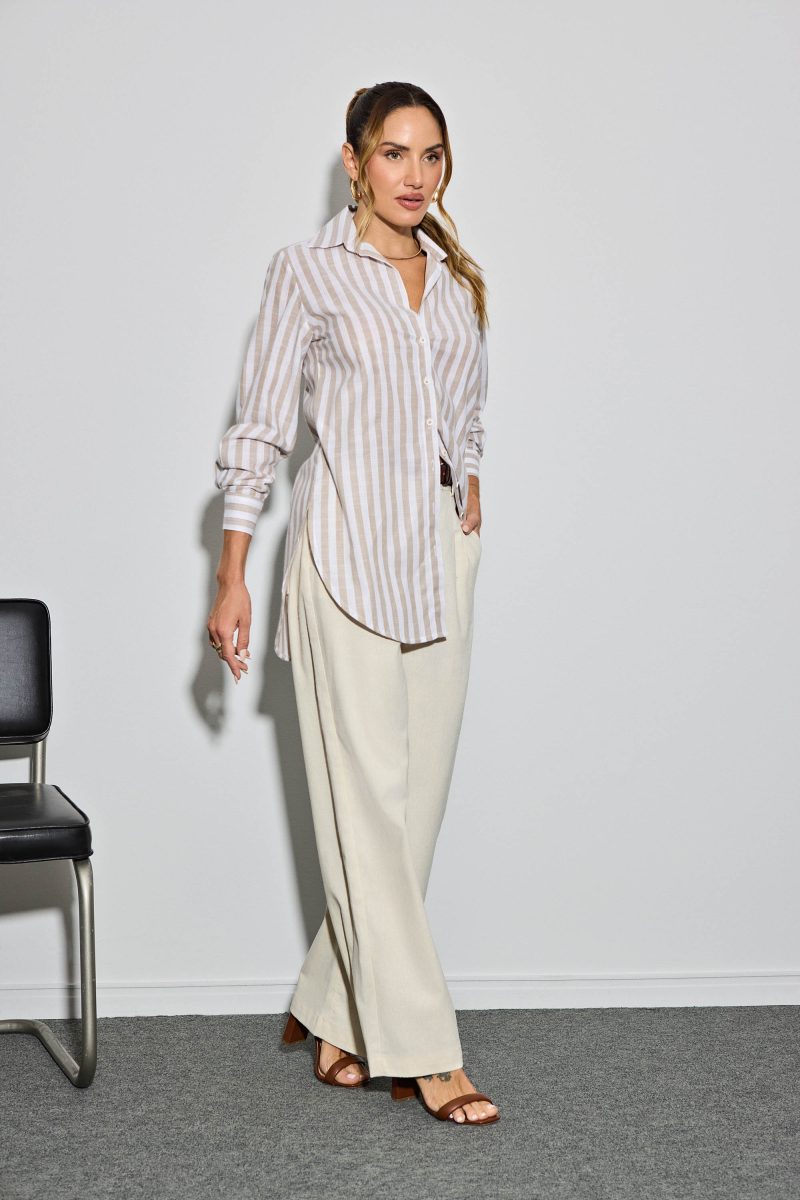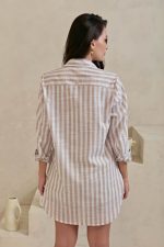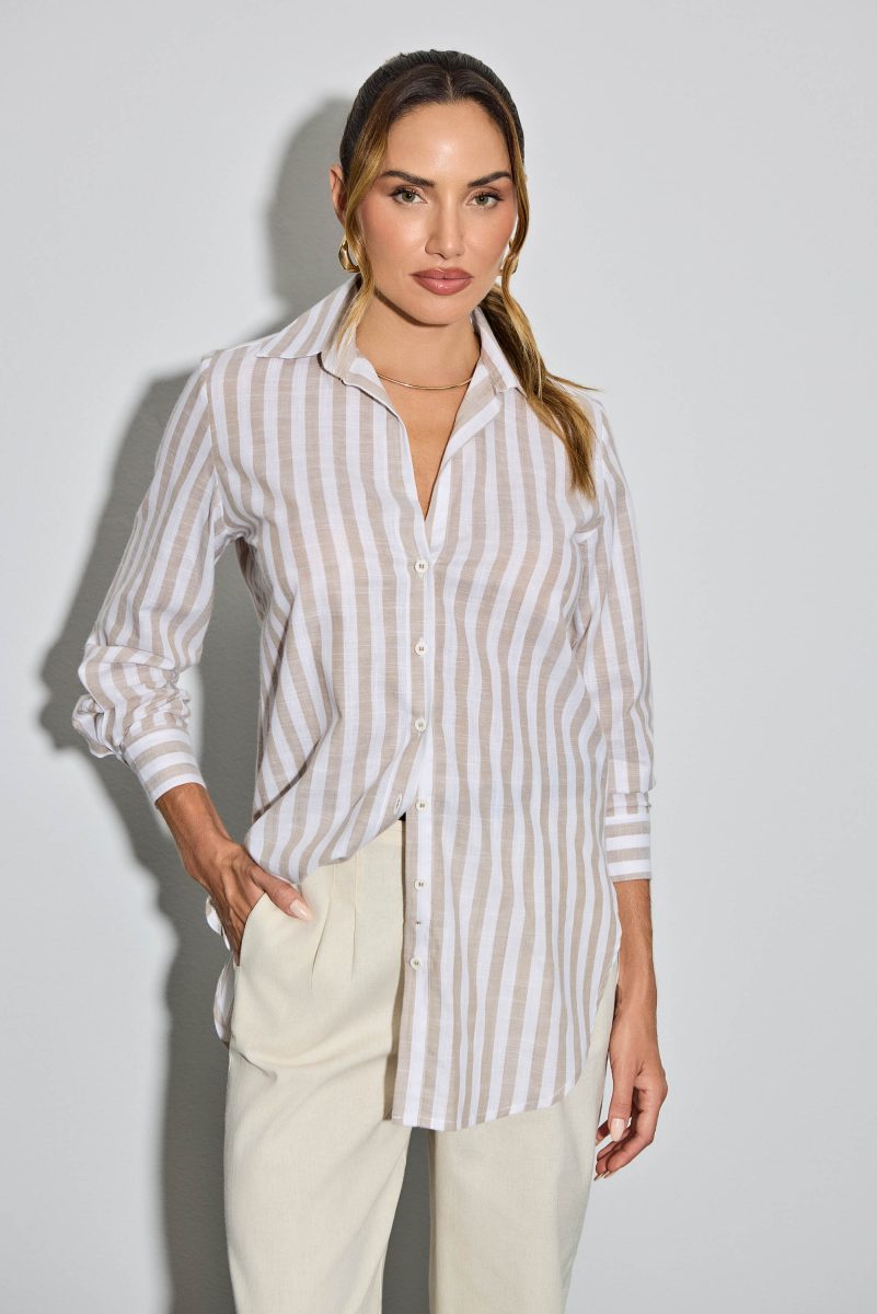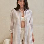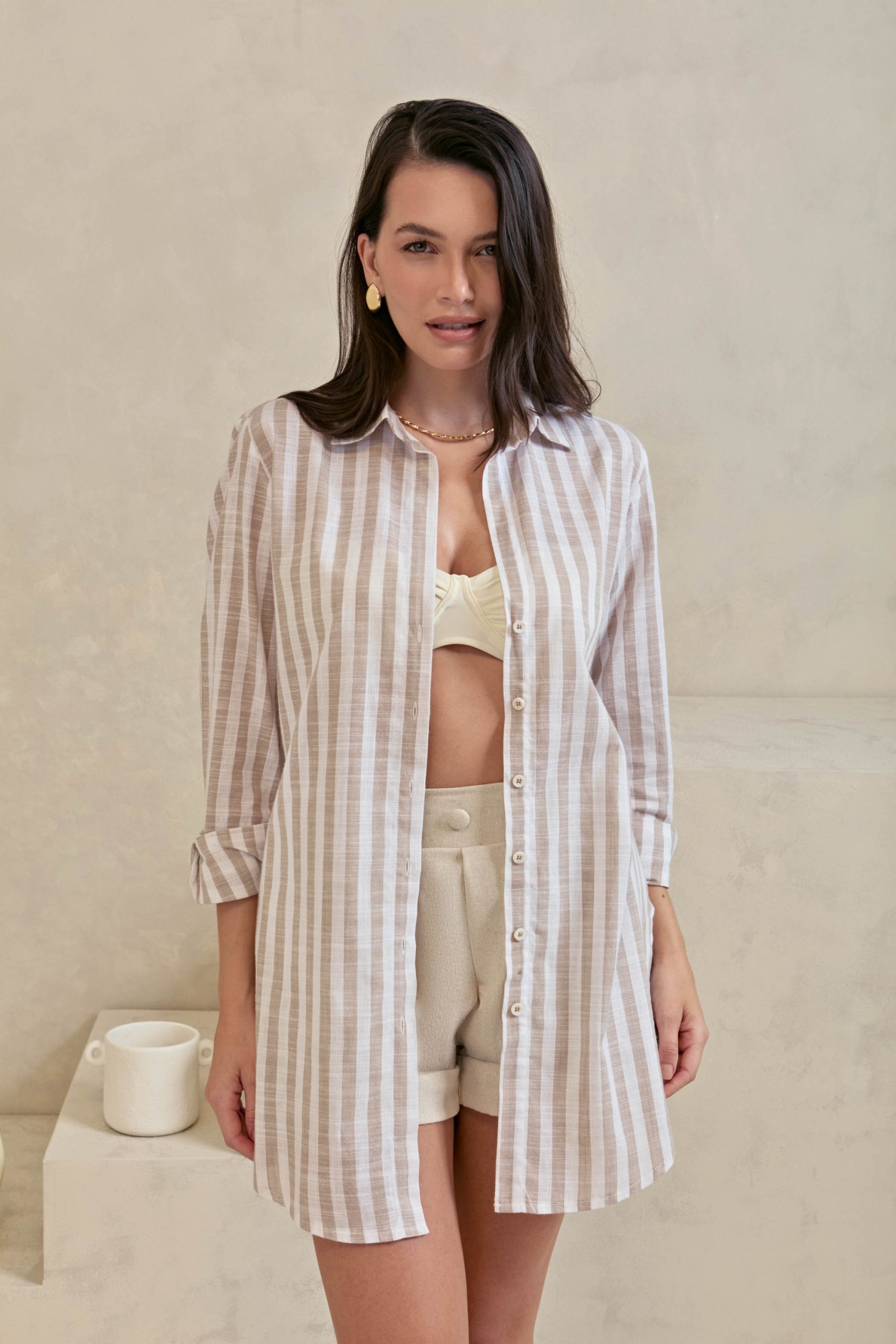 Apresentamos a Camisa Chemise Listrada, uma peça que combina elegância e praticidade de maneira impecável. Confeccionada em tecido 100% algodão com textura de linho, esta chemise oferece uma sensação de leveza e frescor, tornando-a a escolha ideal para os dias quentes de verão. Seu comprimento alongado adiciona um toque de sofisticação e versatilidade, permitindo que seja usada de diversas maneiras.