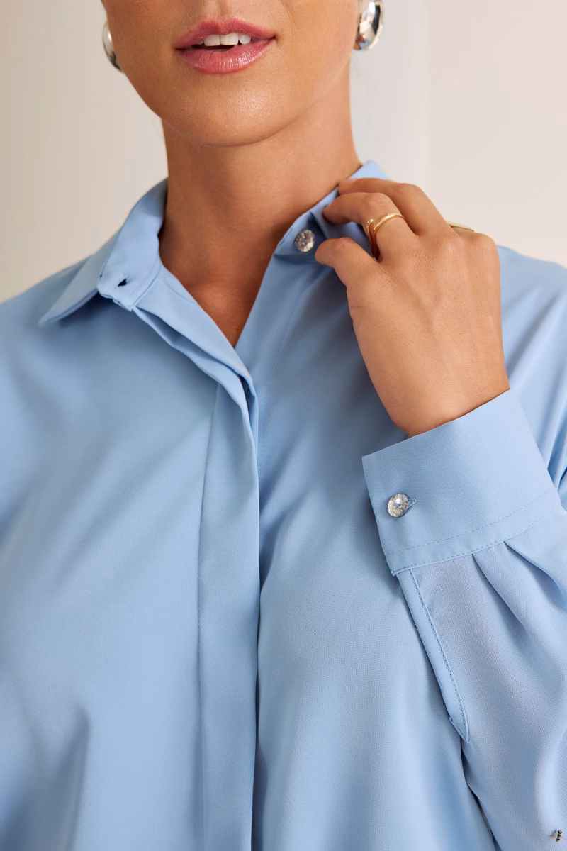 Seu botão em brilho acrescenta um toque delicado e refinado, elevando a peça com um detalhe sutil e luxuoso. A manga longa e o corte clássico reforçam sua versatilidade, permitindo combinações que vão da alfaiataria para um visual formal a peças mais leves para um look social moderno.