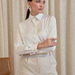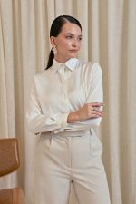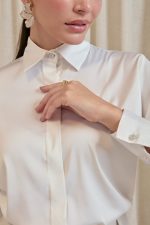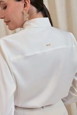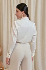 -Decote: Vista escondendo os botões. Botão da gola e punho em delicado formato de flor com pérolas.
