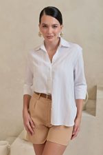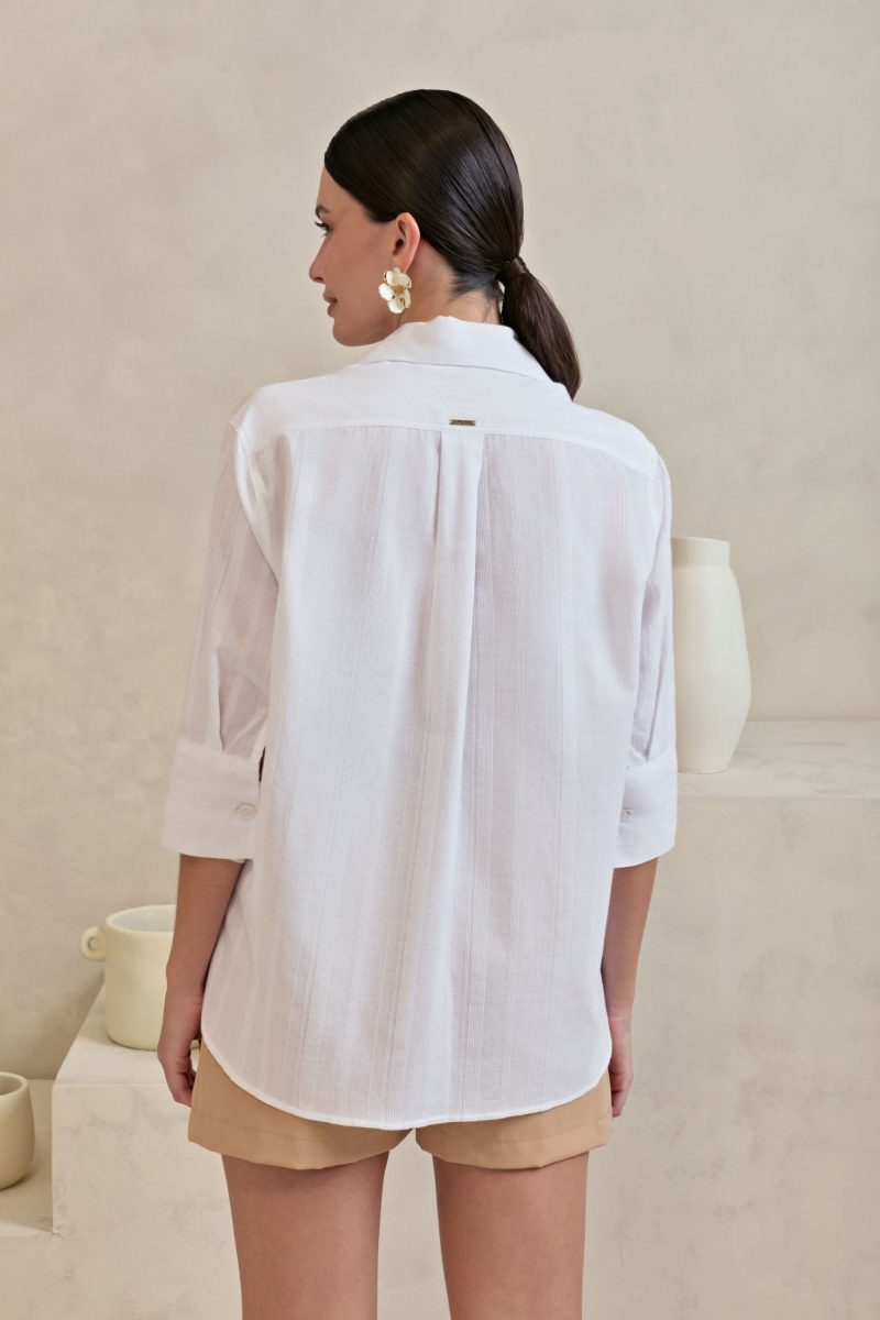 A Camisa feminina Luiza foi desenvolvida em tecido 100% algodão texturizado, ideal para compor looks modernos e práticos, pode ser usada em eventos formais ou informais. A peça conta com um sofisticado punho de 10 centímetros. Além disso, possui manga 3/4 e uma delicada e moderna prega nas costas, que exala ainda mais a autenticidade.