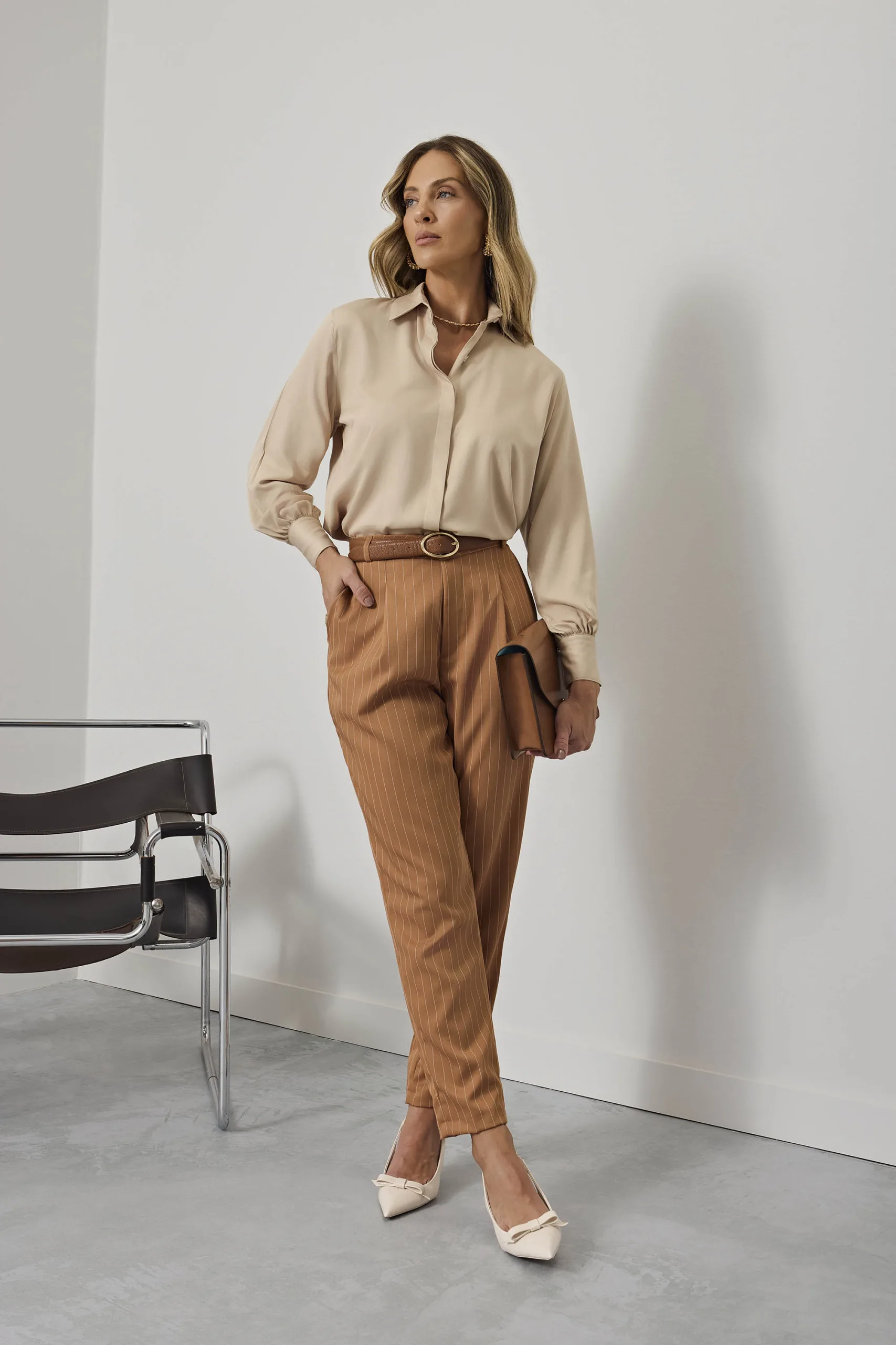 A Camisa Feminina Manga Longa Bege é indispensável no seu guarda-roupa! Desenvolvida para mulheres modernas, elegantes e sofisticadas. Por se tratar de uma versão neutra, há a possibilidade de utilizá-la de inúmeras maneiras. Seu tecido confere uma textura suave e confortável à camisa, proporcionando um caimento impecável. A vista dupla escondendo os botões eleva o seu visual. Além disso, os botões do punho e da gola, possuem um design exclusivo para acrescentar originalidade e estilo à camisa. Sua modelagem slim proporciona um visual acinturado, moderno e interessante.