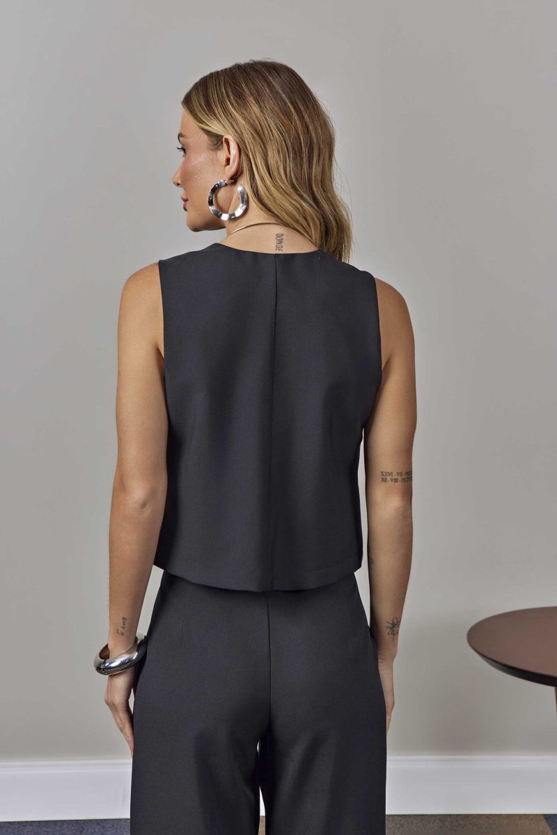 Seu design de alfaiataria apresenta um corte ajustado na medida certa, com fechamento por botões que conferem um toque clássico e sofisticado. A ausência de mangas e o decote levemente alongado criam uma silhueta elegante e versátil, permitindo combinações que vão do look formal ao moderno e despojado.